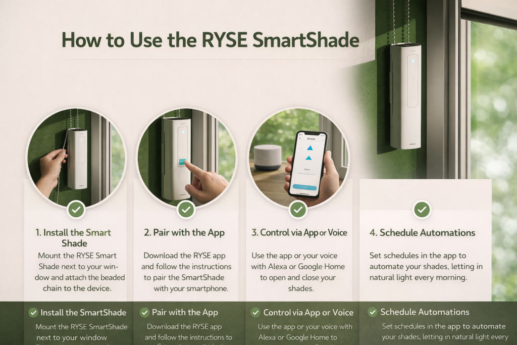 Upgrade your home with smart automation in just a few simple steps. The RYSE SmartShade allows you to control your existing beaded-chain window shades using your smartphone, voice assistants, or scheduled automation — no full shade replacement required.